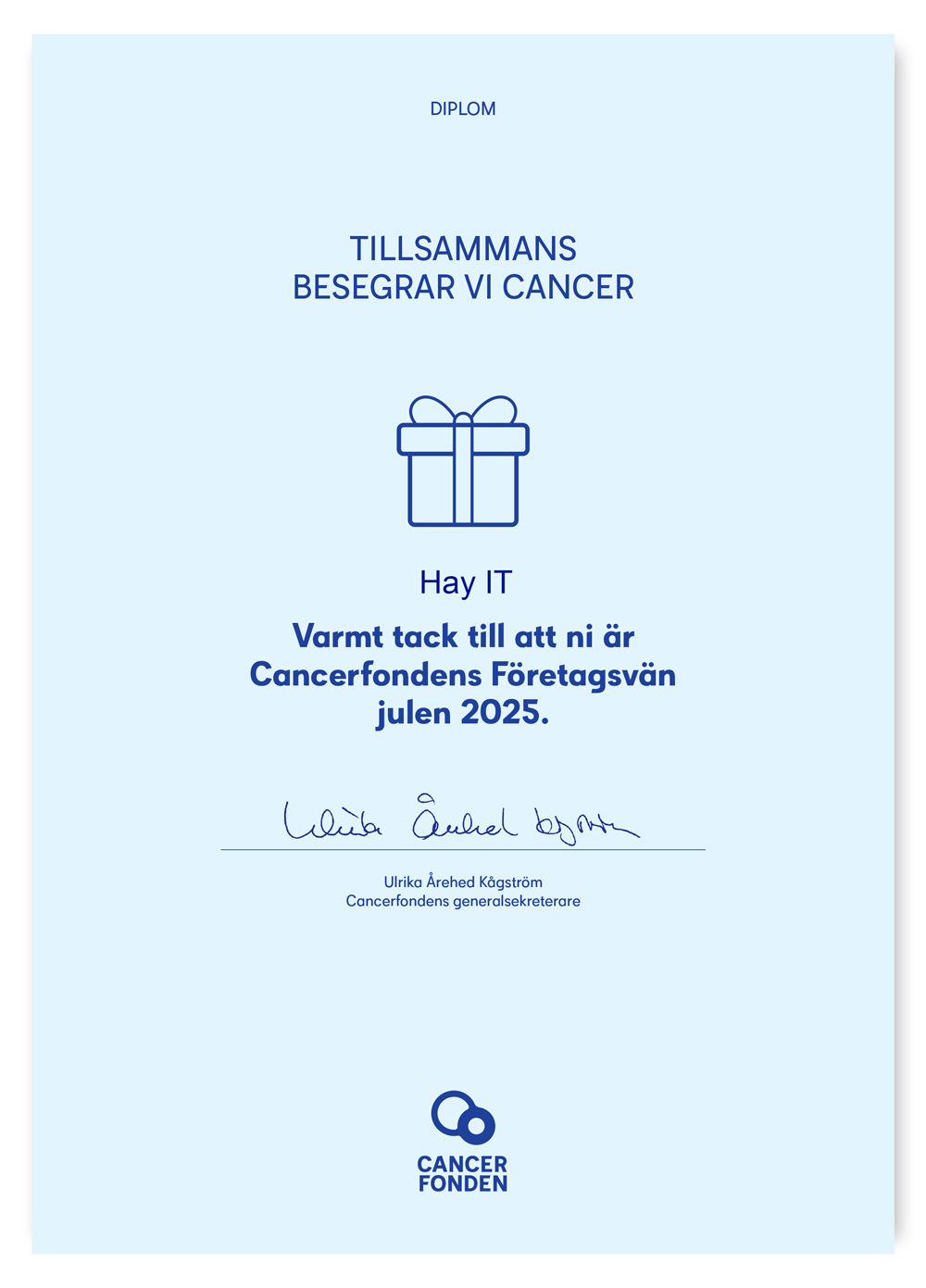 Julen är en tid för kärlek, reflektion, återhämtning och att umgås med nära och kära. Vi vill ge fler den möjligheten i framtiden och har därför gett en gåva till Cancerfonden.